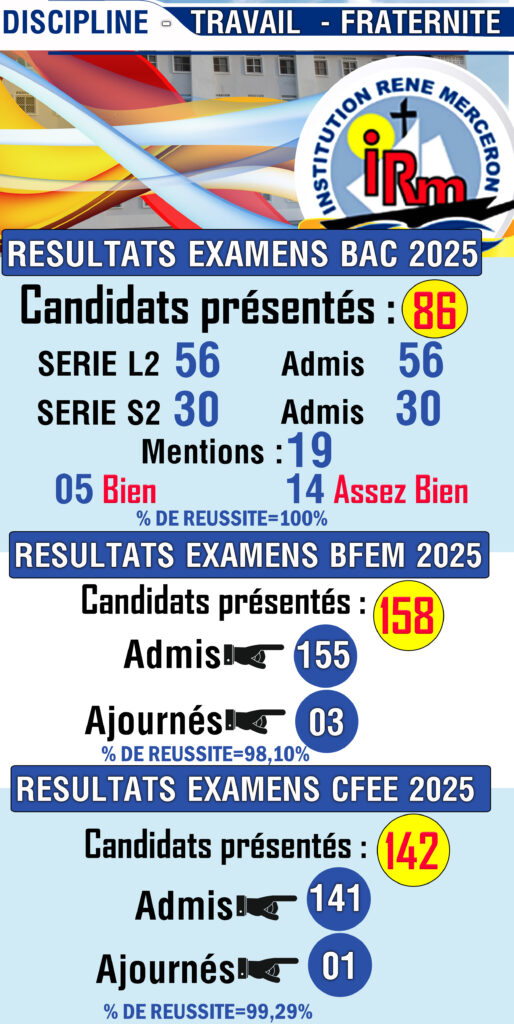 Le portail de l’Institution René Merceron de Mbour-Saly est un site qui a pour objectif de rendre visibles les activités scolaires et de vous faciliter l’accès à l’information. Il a pour ambition de rapprocher l’école des familles pour une action éducative plus efficiente. Ce site a pour ambition de vous ouvrir le plus possible à la vie scolaire de l’IRM. Chers internautes, soyez les bienvenus et n’hésitez surtout pas à nous faire parvenir vos observations et suggestions pour améliorer la qualité de l’information que nous souhaitons mettre à votre disposition.